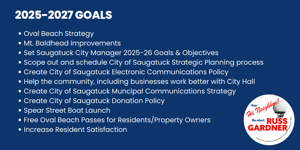 Hi Neighbor. My name is Russ Gardner. I decided to re-run for Saugatuck City council because I care too much about our city’s future not to. I’ve lived here almost my entire life and with many critical issues facing the City, the stakes are just too high to not remain involved.